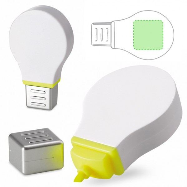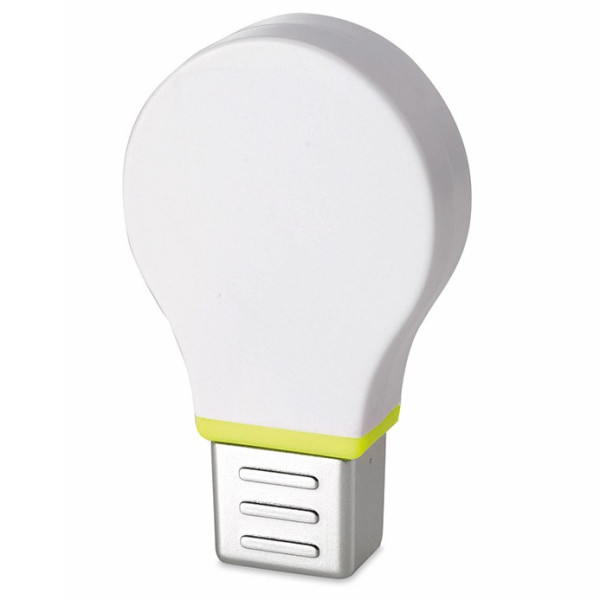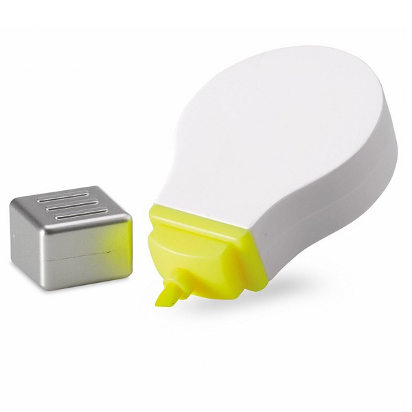 Marcador fluorescente con original diseño de bombilla y cuerpo en acabado blanco brillante, especialmente diseñado para marcaje en digital y tampografía.