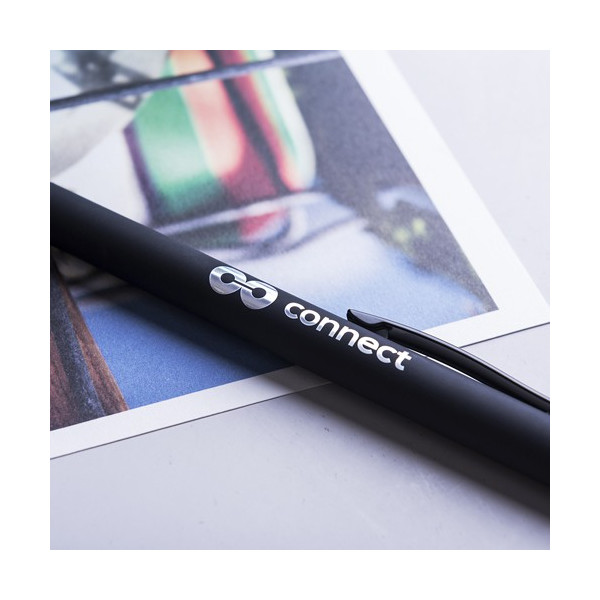 Bolígrafo puntero de mecanismo giratorio con cuerpo de acabado sólido en color negro y pulsador en variada gama de colores. Clip metálico en color negro. Especialmente diseñado para marcaje en láser y con un recubrimiento exterior especial para que tu publicidad quede perfectamente grabada, a juego con el color del puntero. Cartucho jumbo y tinta azul.