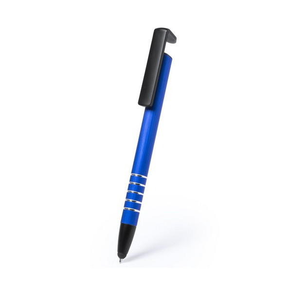 Bolígrafo - Lápiz con soporte para dispositivo móvil integrado en clip. De mecanismo pulsador y cuerpo de suave aluminio con tacto especial en vivos colores metalizados. Tinta azul.