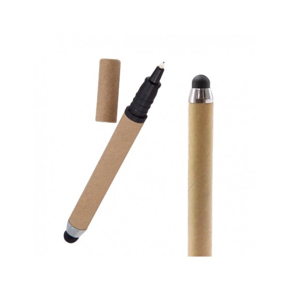 Bolígrafo con sistema touch y capucha en combinación de cuerpo en cartón reciclado de color natural y accesorios en color negro y plateado.