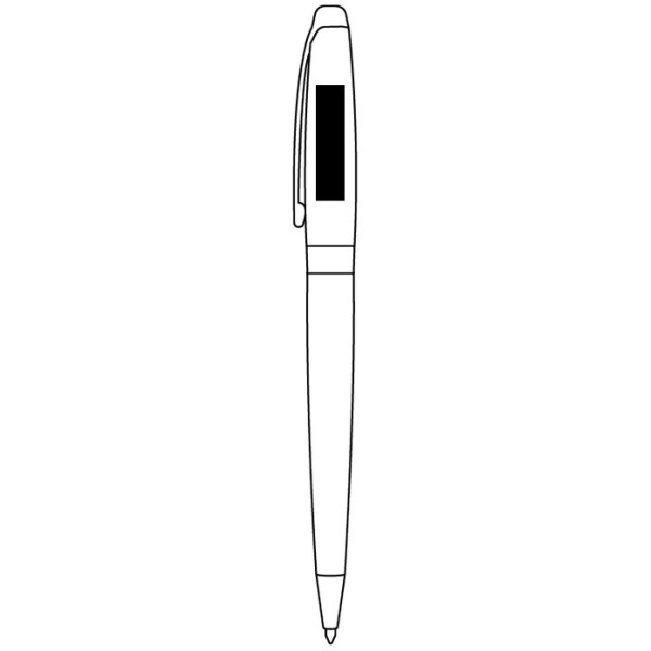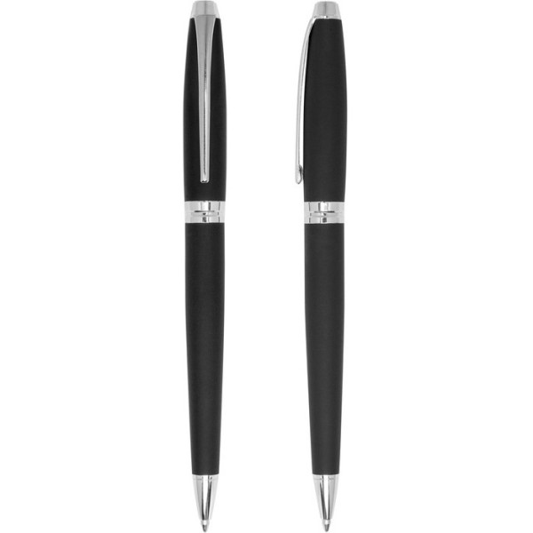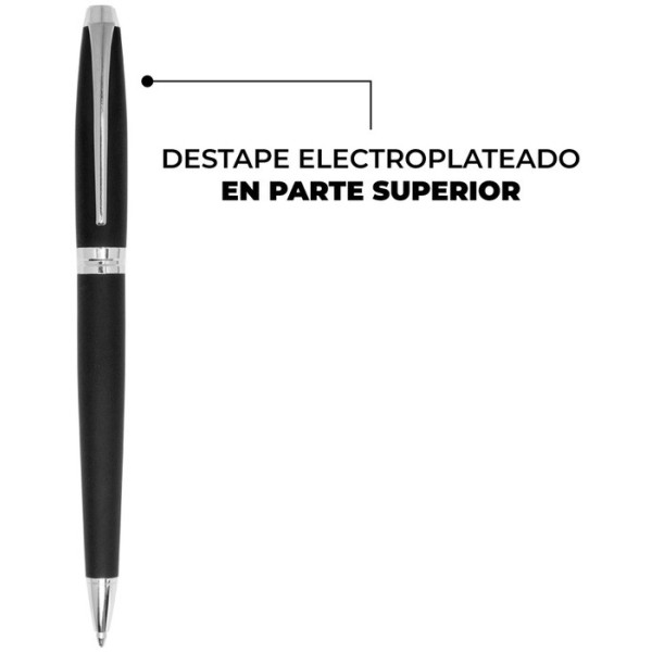 Lápiz o bolígrafo metálico con cuerpo color negro engomado, con apertura giratoria y tinta negra.
