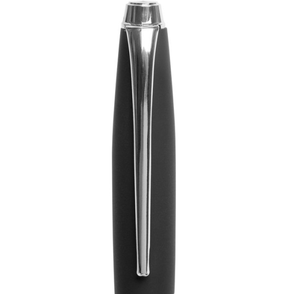 Lápiz o bolígrafo metálico con cuerpo color negro engomado, de clip, puntera y detalles en color plata.