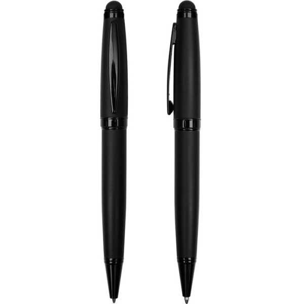 Cuerpo metálico negro mate con clip y puntera metálicos negro brillo. Bolígrafo con puntera touch y con apertura giratoria.