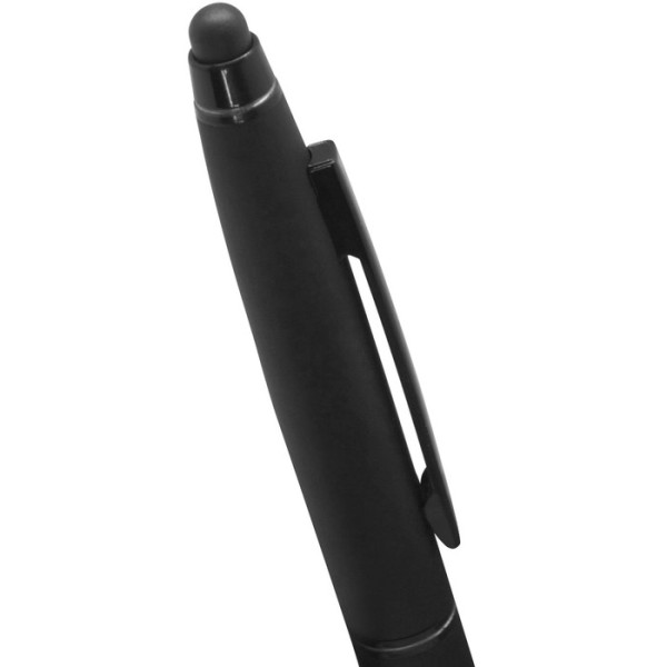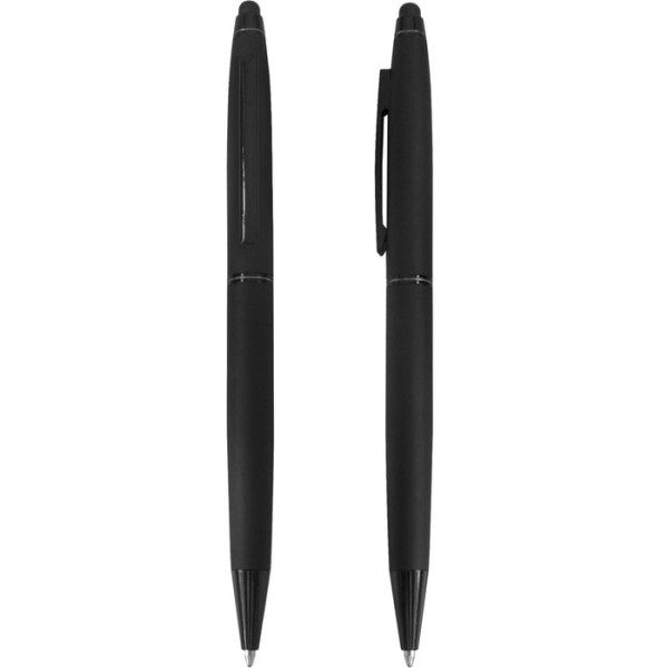 Bolígrafo con sistema touch y apertura giratoria. Cuerpo color negro mate y la puntera y clip color negro brilloso.