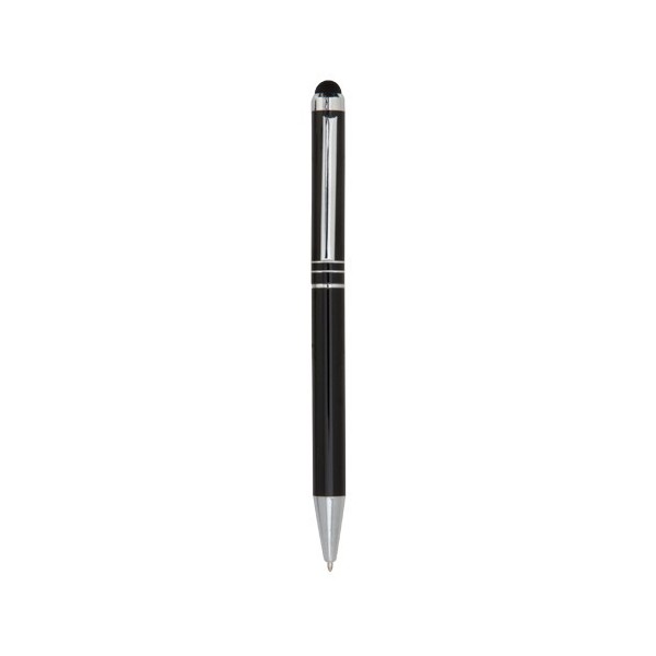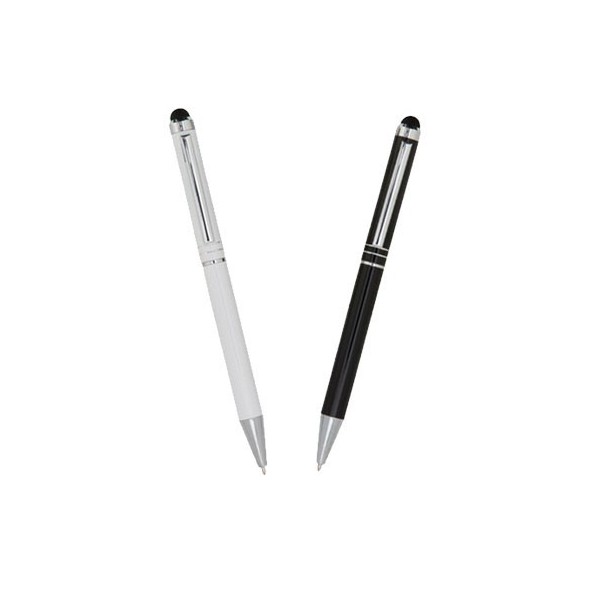 Bolígrafo con sistema Touch-Screen, de mecanismo giratorio con cuerpo en aluminio de suave acabado metalizado en variados colores. Accesorios y anillas en color plateado.
