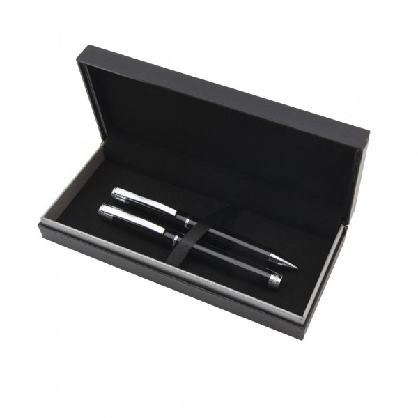 Set de bolígrafo de mecanismo giratorio y roller de capucha en sobrio diseño.