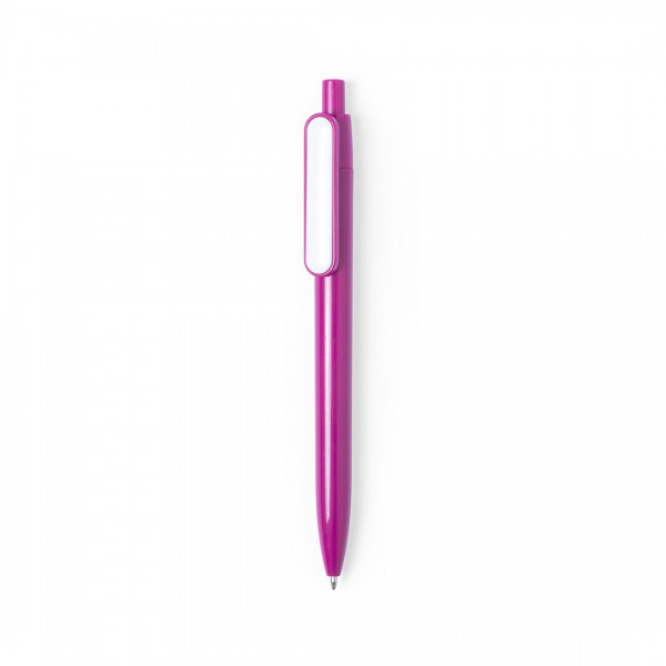 Bolígrafo de cuerpo completo al tono y material plástico, con mecanismo con pulsador y gran clip de superficie blanca.