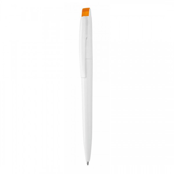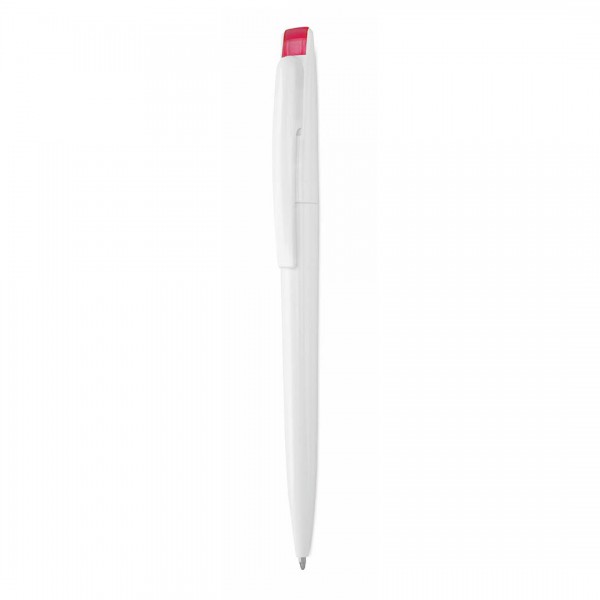 Bolígrafo de mecanismo giratorio de atrevido diseño bicolor con accesorios en vivos colores translúcidos y cuerpo de suave acabado en color blanco sólido y original clip curvado.
