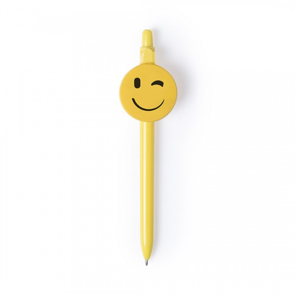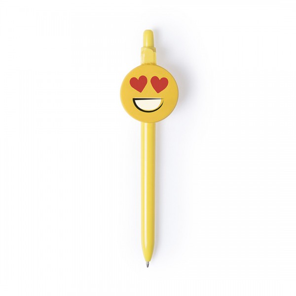 Bolígrafo de divertidos diseños emoji en llamativo color amarillo. Con mecanismo pulsador, de suave cuerpo en acabado brillante y original clip circular.