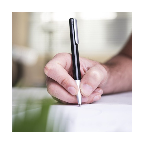 Bolígrafo de mecanismo giratorio y sobrio diseño bicolor con accesorios en color plateado mate y cuerpo de acabado sólido en colores brillantes. Especialmente diseñado para tampografía en clip y en cuerpo. De cartucho jumbo y en tinta azul.