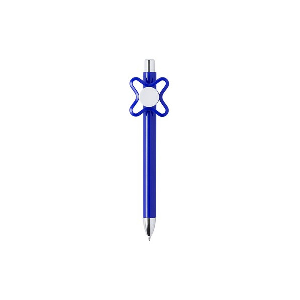 Original bolígrafo spinner antiestrés de mecanismo pulsador y divertido diseño con accesorios en color plateado y cuerpo de acabado sólido en colores brillantes. Especialmente diseñado para tampografía en clip y en cuerpo. De cartucho jumbo y en tinta azul.