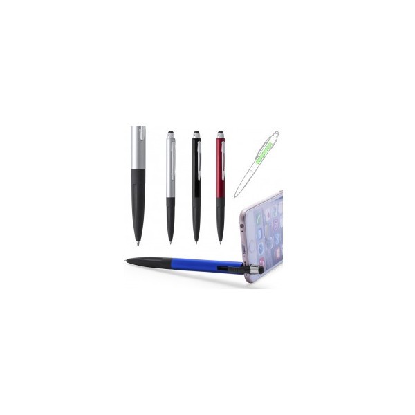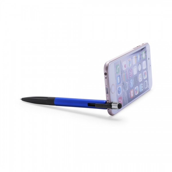 Bolígrafo SISTEMA TOUCH con mecanismo giratorio con soporte retráctil integrado para dispositivo móvil.
