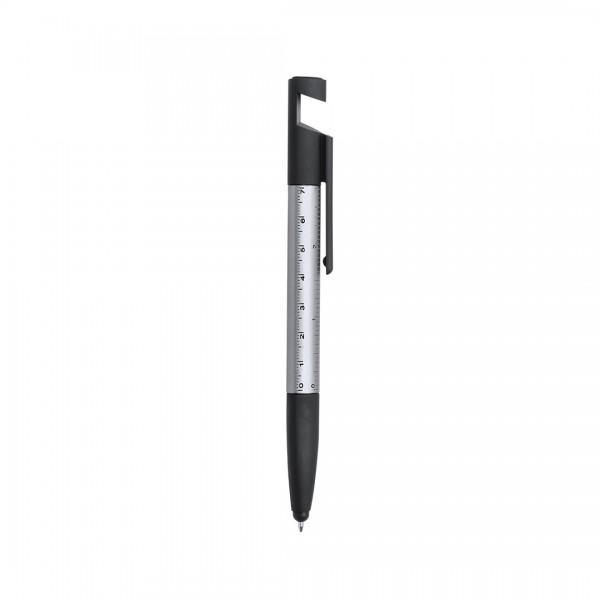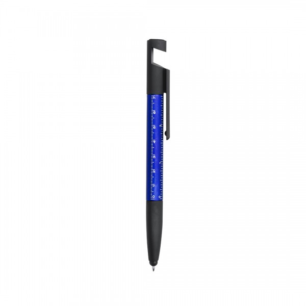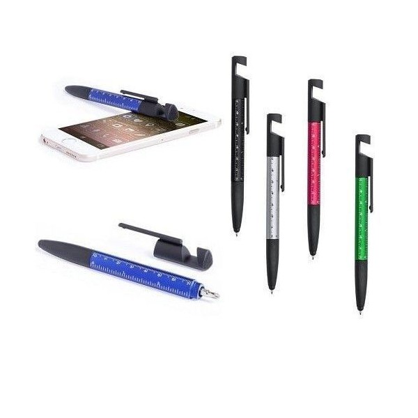 Bolígrafo 7 en 1 de mecanismo giratorio en variada gama de vivos colores. Con soporte para dispositivo móvil, puntero, limpiador de pantalla, regla integrada en cuerpo -cm y pulgadas-, destornilladores de punta plana y de estrella.
