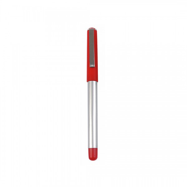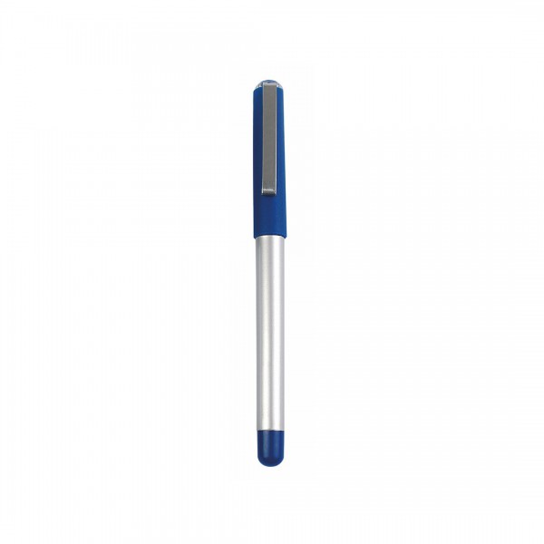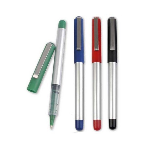 Bolígrafo ROLLER de capucha de elegante diseño bicolor con cuerpo de suave acabado en color plateado brillante. Con accesorios en vivos colores sólidos y punta juego.