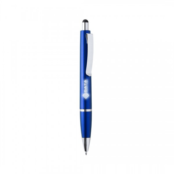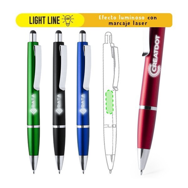 Bolígrafo puntero con luz led interior y cuerpo especialmente diseñado para marcaje en láser, iluminando así el logotipo. Con suave cuerpo en variada gama de colores metalizados y tinta azul. Pilas de botón incluidas.