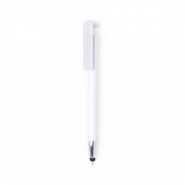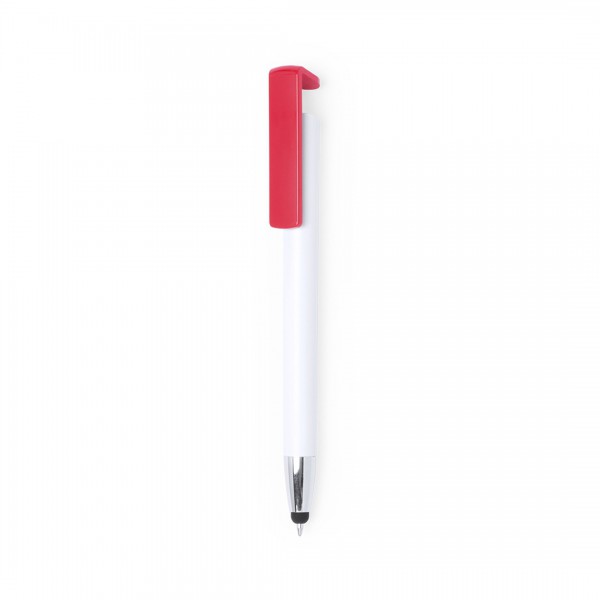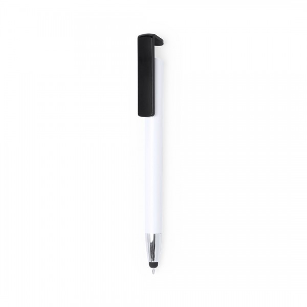 Bolígrafo puntero de mecanismo pulsador con soporte integrado clip para dispositivo móvil.