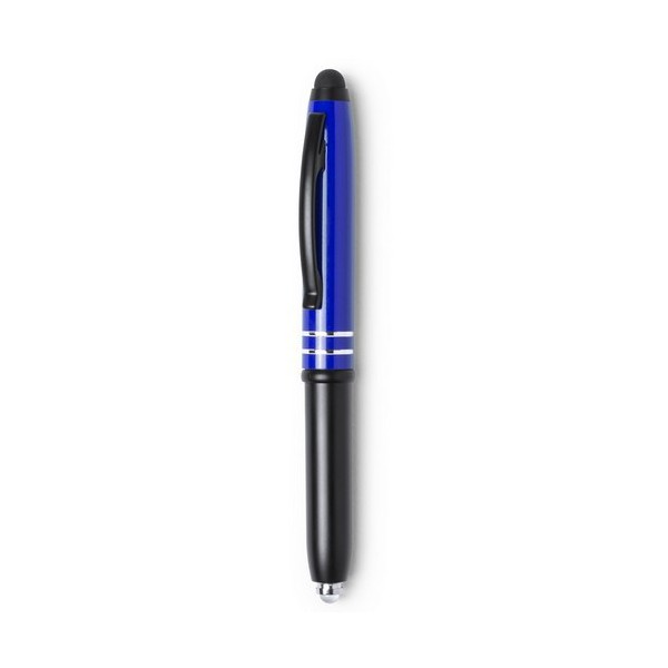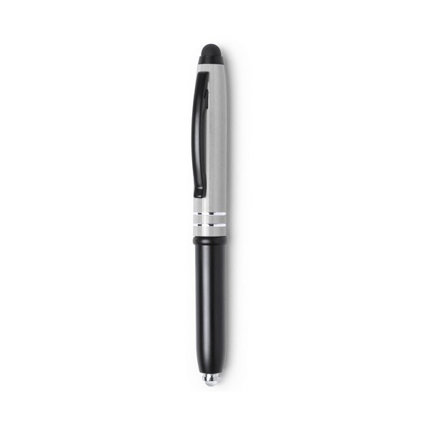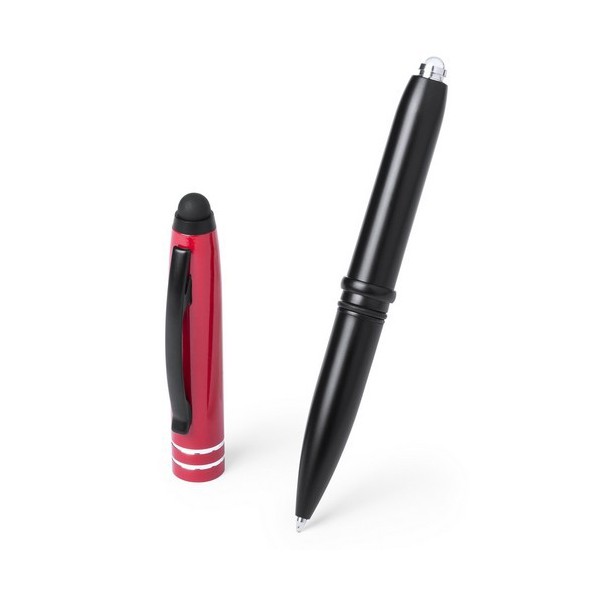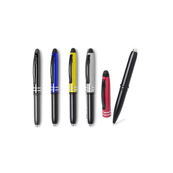 Cuerpo mixto plástico/metal con acabado metalizado, con sistema touch. Capucha de aluminio en vivos colores, de elegante diseño bicolor y accesorios en color negro (ABS), con linterna integrada y baterías incluida.