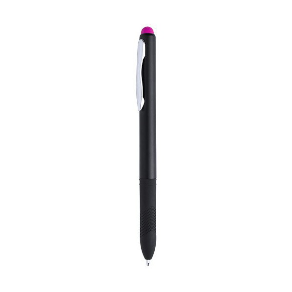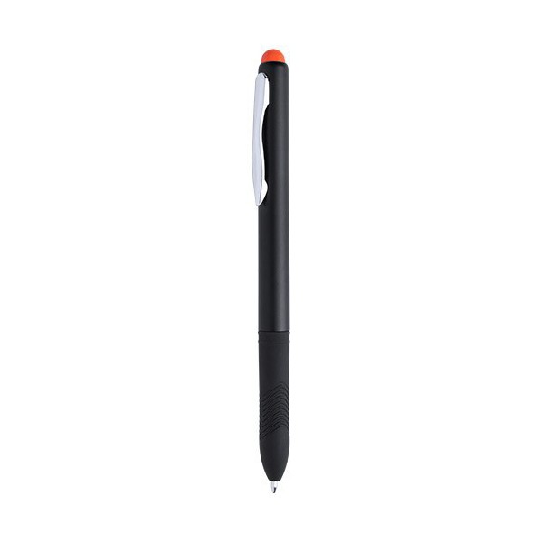 Cuerpo de acabado sólido en color negro con características touch y mecanismo giratorio en diseño bicolor con accesorios en color plateado brillante y clip metálico. Empuñadura de original diseño.
