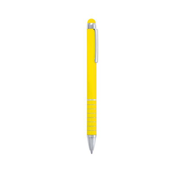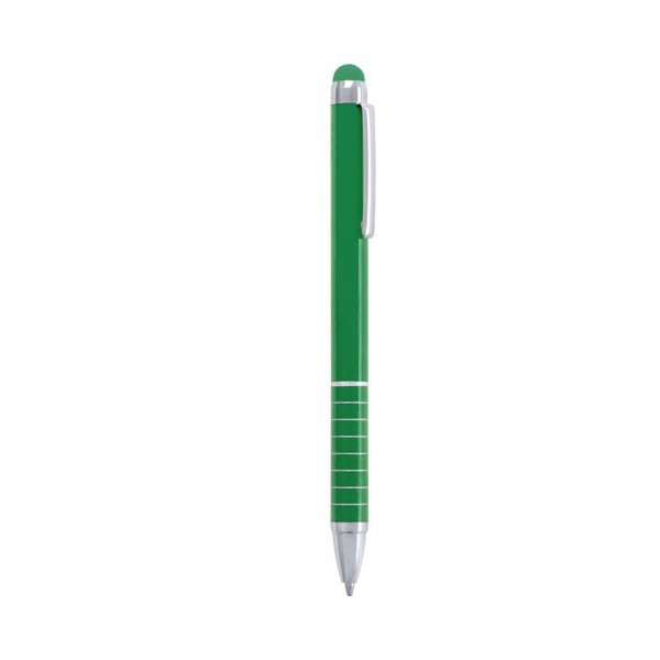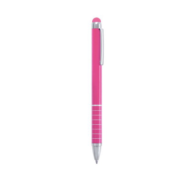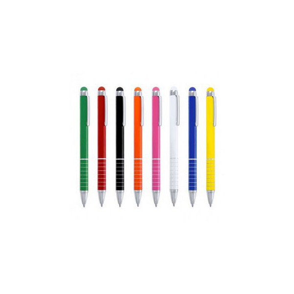 Cuerpo de acabado sólido en vivos colores metalizados con sistema touch con goma al tono del lápiz y mecanismo giratorio de elegante diseño bicolor con accesorios en color plateado brillante y clip de aluminio y empuñadura de original diseño de anillas.