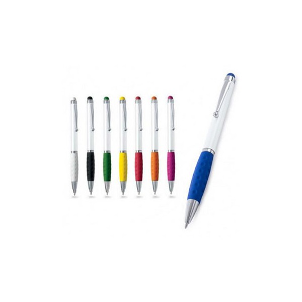 Cuerpo de acabado sólido en color blanco brillante con empuñadura de colores vivos. Con sistema touch y mecanismo giratorio, con accesorios en color plateado brillante y clip metálico.