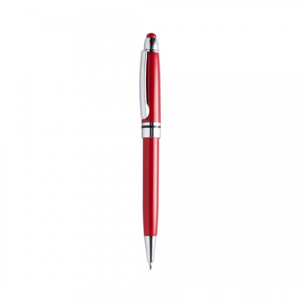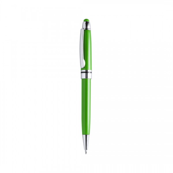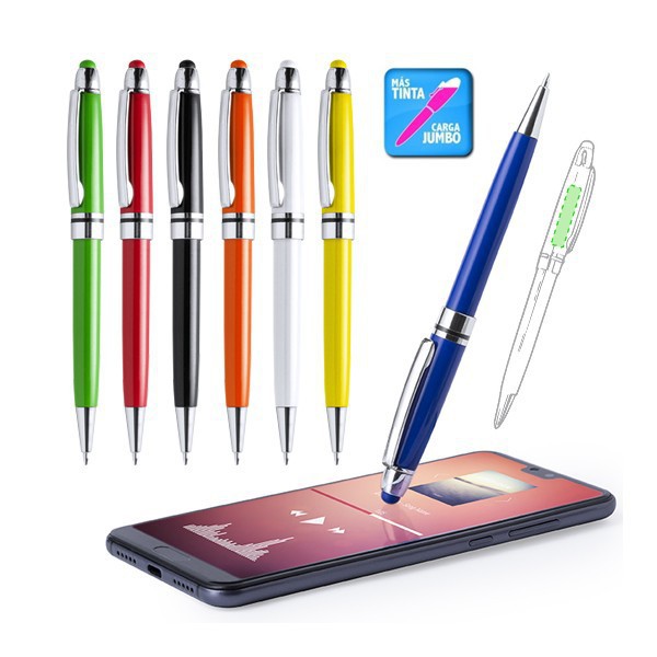 Bolígrafo puntero de colorido diseño, con cuerpo en vivos colores brillantes a juego con el puntero. De mecanismo pulsador, con detalles cromados y clip metálico.