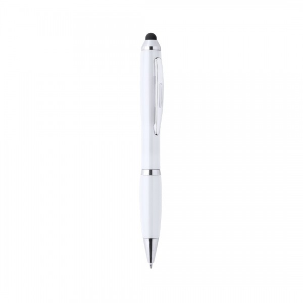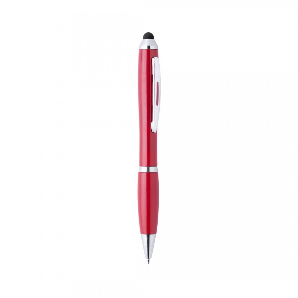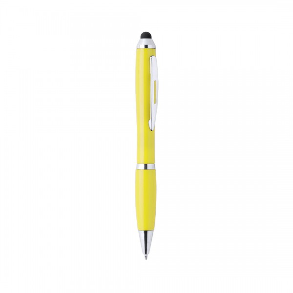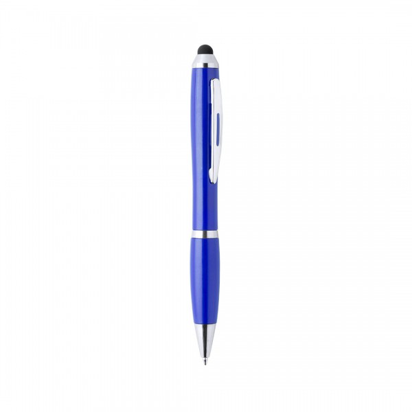 Bolígrafo puntero de colorido diseño, de apertura giratoria y cuerpo en vivos colores brillantes a juego con la empuñadura. Con detalles cromados y clip metálico.