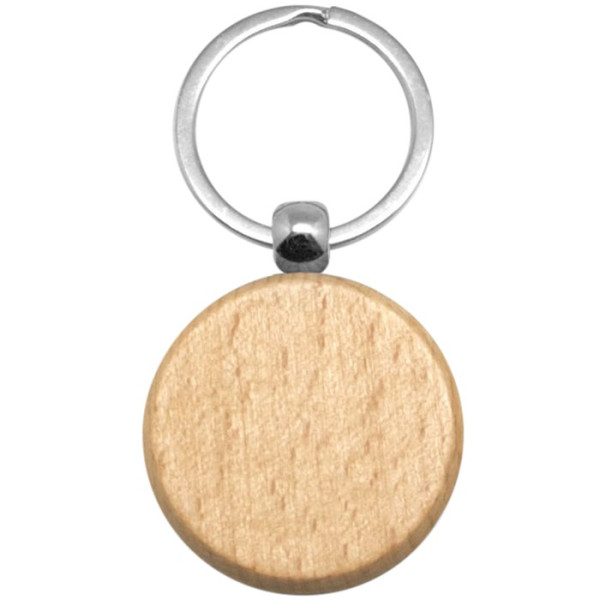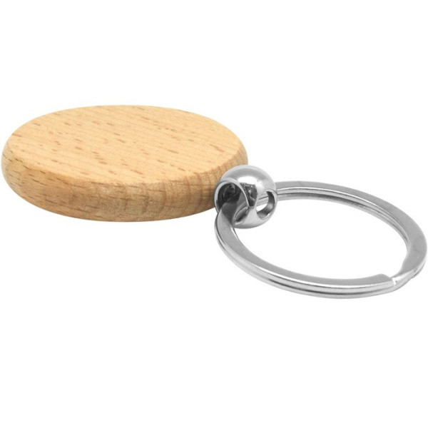 Madera. Llavero redondo con aro metálico.