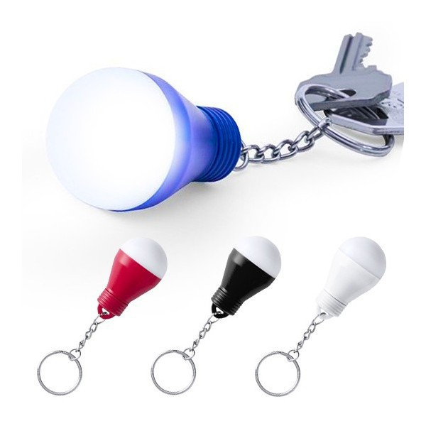 Llavero linterna 1 led en original forma de bombilla con cuerpo de suave acabado brillante en variados colores. Pilas de botón incluidas.