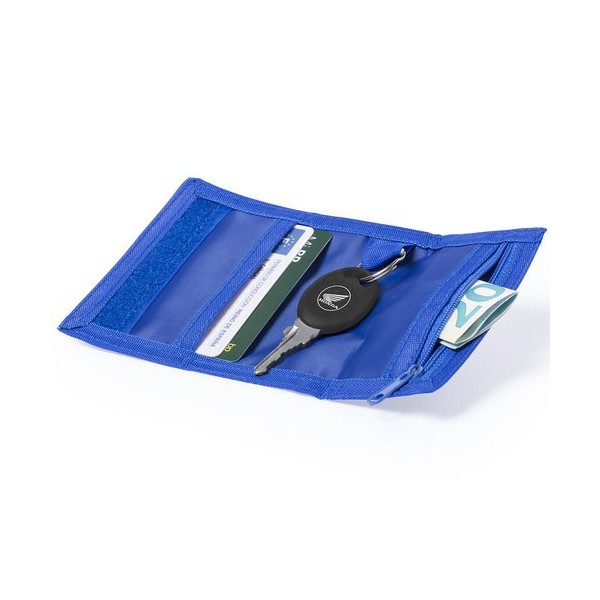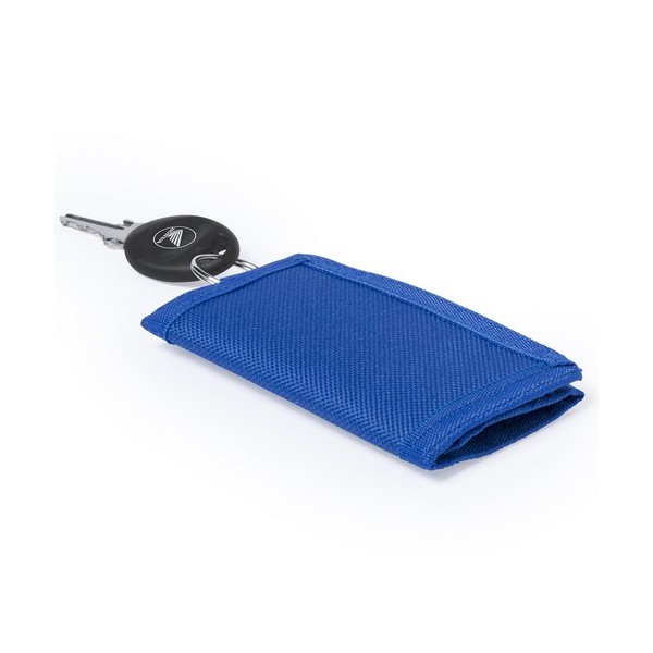 Llavero monedero en resistente poliéster 600D de vivos colores y cierre de velcro. Interior con monedero de cierre de cremallera, compartimento para tarjeta y anilla llavero.