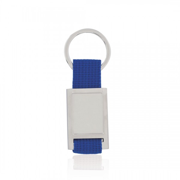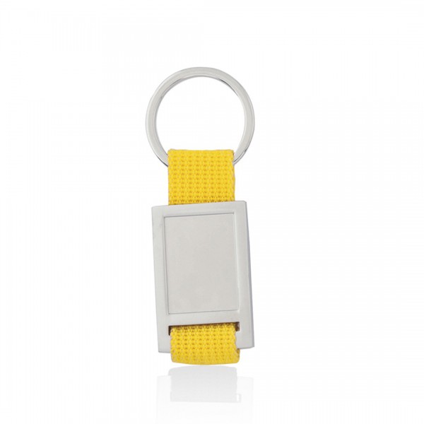 Llavero de divertido diseño con cinta de poliéster de variados y vivos colores. Con cuerpo metálico troquelado especialmente diseñado para marcaje en doming/gota de resina.