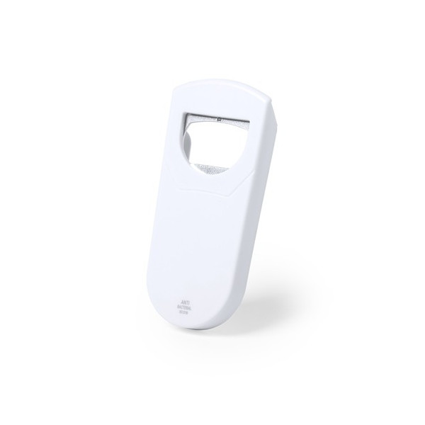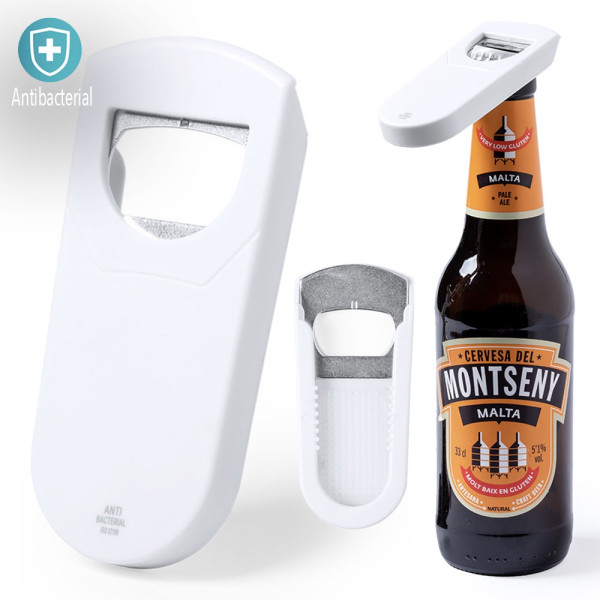 Abridor antibacteriano con resistente cuerpo de acabado sólido y pieza central de apertura metálica. Parte trasera con función tapón para botellas. Especialmente diseñado para marcaje en tampografía.