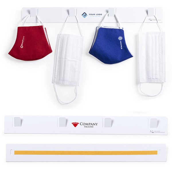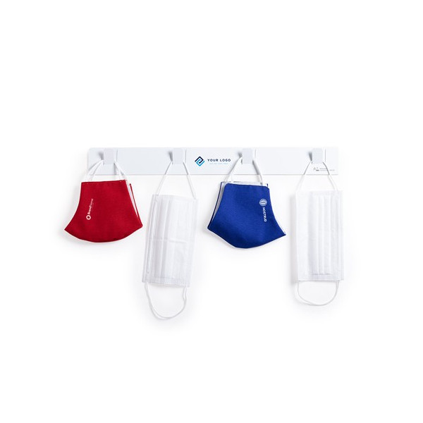 Colgador para mascarillas en resistente material PVC de acabado blanco sólido. Incluye 4 soportes separados entre sí, para colgar todo tipo de mascarillas y evitar el contacto entre ellas. Diseñado especialmente para hostelería, hogar y oficina. Con tira adhesiva de doble cara para fijación extra fuerte en todo tipo de superficies y troquelado para instalación con alcayatas (no incluidas). Amplia zona de marcaje y fácil de desinfectar después de cada uso.