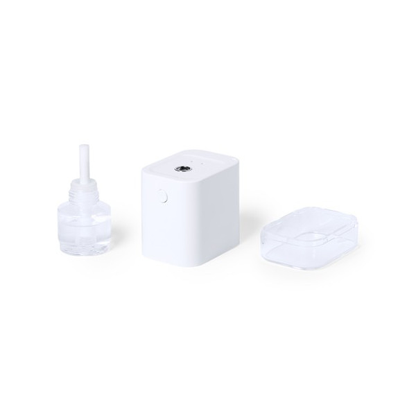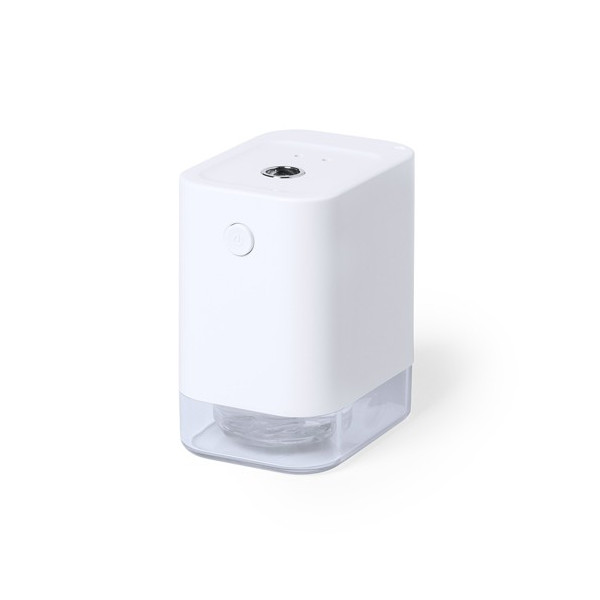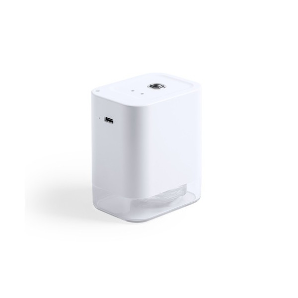 Dispensador automático de alcohol para higiene y limpieza de la piel, con sensor de movimiento de infrarrojos y led indicador. Tamaño compacto y discreto acabado en color blanco mate especialmente indicado para marcaje en tampografía, con depósito de 45 ml fácilmente rellenable (alcohol no incluido), más filtro y muelle de recambio. Batería de iones de litio de 1.800 mA y capacidad de conversión electrónica ? 90%. Recargable mediante cable USB tipo C de 1 metro de largo en color a juego,. Presentado en atractiva caja de diseño, disponible manual de instrucciones en español en inglés.