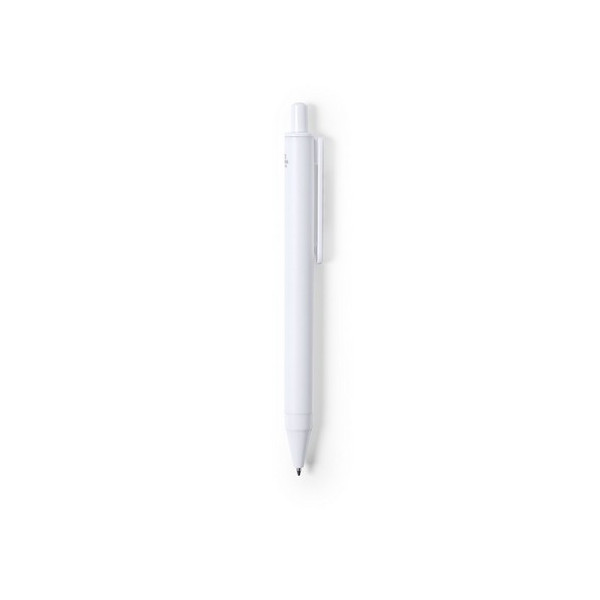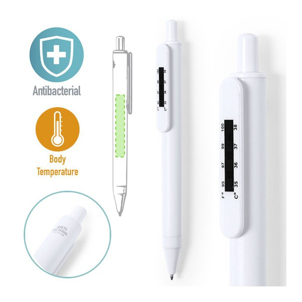 Bolígrafo antibacteriano de mecanismo pulsador con termómetro integrado en clip. Diseño monocromático, especialmente diseñado para marcaje en tampografía. En tinta azul y presentado en bolsa individual de diseño.