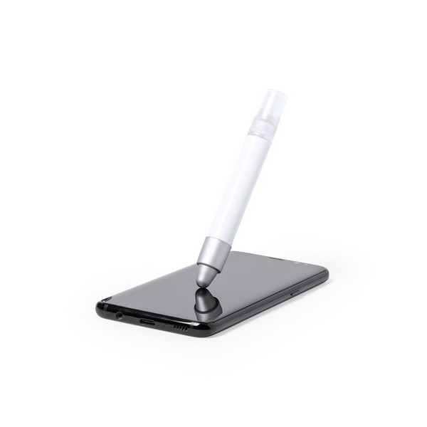 Bolígrafo antibacteriano con pulverizador recargable integrado y capucha protectora con puntero en color gris. Acabado liso en resistente ABS brillante con detalles cromados y escritura en tinta azul. Capacidad del pulverizador 3ml. Líquido no incluido.