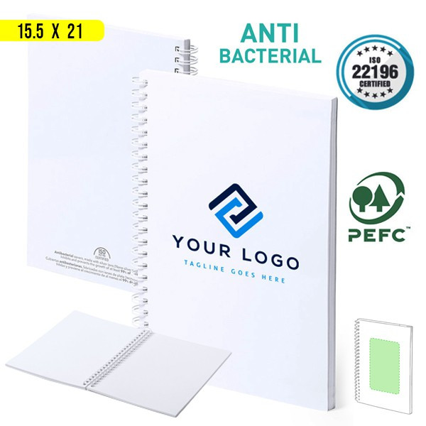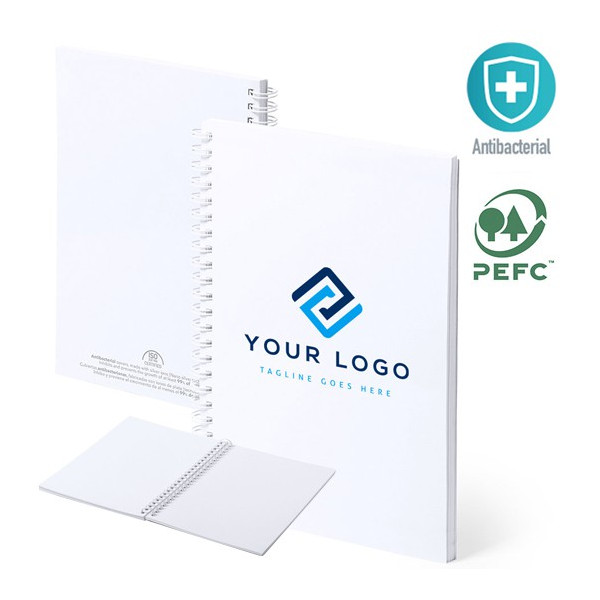 Libreta A5 con tapas antibacterianas flexibles de cartón laminado.