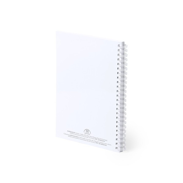 Libreta tamaño A5 con tapas antibacterianas flexibles de cartón laminado. En elegante acabado blanco mate, con anillas a juego. Cubiertas antibacterianas fabricadas con iones de plata (tecnología nano silver) que inhiben y previenen el crecimiento de al menos el 99% de las bacterias. Incluye 80 hojas de papel lisas en color blanco, calidad 80g/m2. Certificación PEFC disponible.