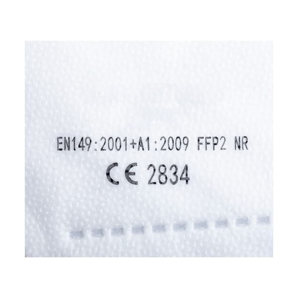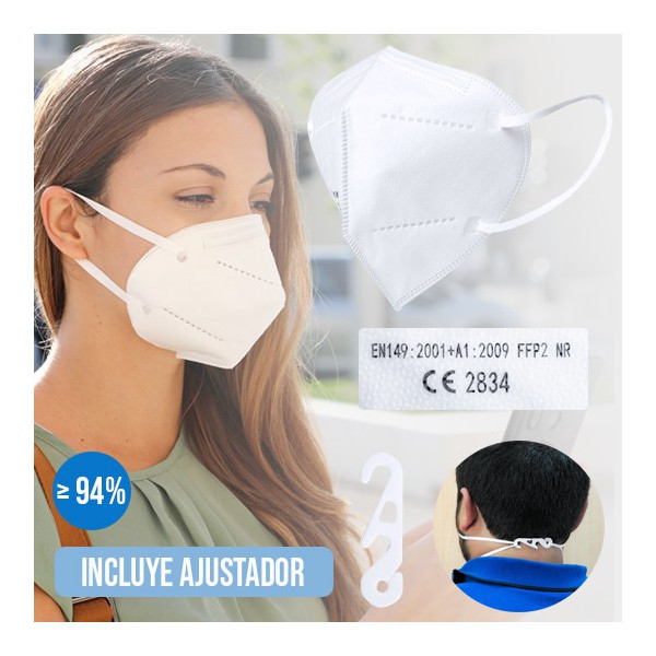 Mascarilla autofiltrante de proteccio?n y seguridad FFP2 en color blanco. Con doble protección, tanto para el portador de la mascarilla como para las personas del entorno. Fabricación de 5 capas y acabado termosellado, incluyendo bandas elásticas de fijación a juego, pinza adaptable en nariz para un firme ajuste y ajustador craneal en color blanco. Presentada en bolsa individual, con manual de instrucciones en español e inglés. Catalogada como EPI (Equipo de Protección Individual) segu?n la Norma Europea EN 149:2001+A1:2009 por organismo notificado nº. 2834, con marcado CE. Eficacia mi?nima de filtracio?n ? 94%. Modelo desechable, no reutilizable. No contiene Látex.
