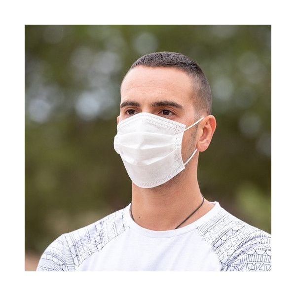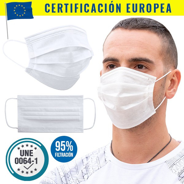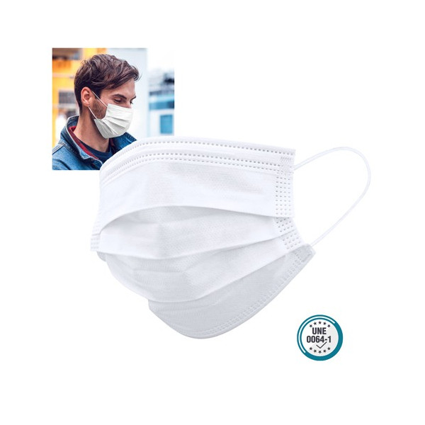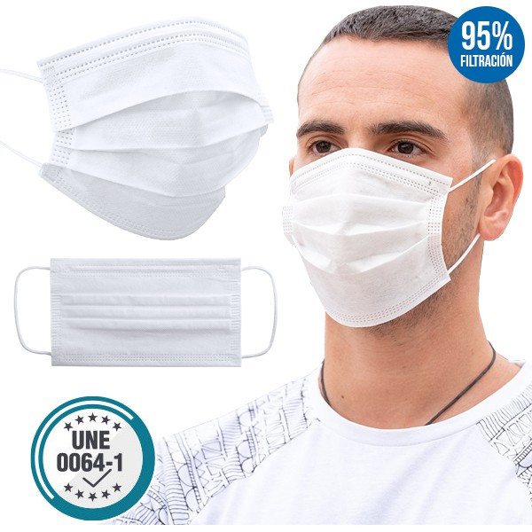 Mascarilla higiénica de triple capa de acabado termosellado, con elásticos de fijación y pinza adaptable en nariz para un firme ajuste. Capas exterior e interior fabricadas en Non-Woven (polipropileno). Capa intermedia en Meltblown (compuesta en un 90% de polipropileno y en un 10% de viscosa). En cumplimiento con la Especificación UNE 0064-1:2020. Eficacia de filtración bacteriana (BFE) ? 95%. Respirabilidad (presión diferencial) < 60 Pa/cm2 No reutilizable.