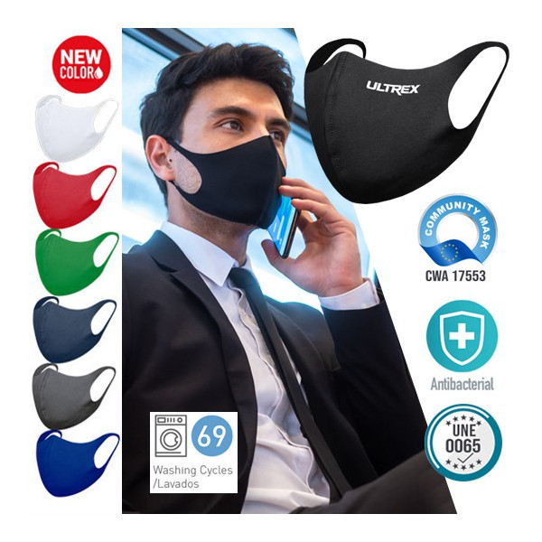Mascarilla higiénica reutilizable elástica. Fabricada en tela soft shell, con propiedades hidrófugas y antibacterianas. Costura frontal ergonómica para un cómodo ajuste en boca y nariz. Disponible en sobria gama de colores. Medidas desplegada: 35x14 cm. Para uso personal en adultos. Certificación por laboratorio acreditado y fabricada según especificación UNE 0065. Acabados y durabilidad de acuerdo al estándar CWA 17553. Propiedades del tratamiento antibacteriano analizadas según ISO 20743: Determinación de la actividad antibacteriana de los productos Textiles. Eficacia de filtración bacteriana: >90% Altamente resistente, hasta 69 lavados. Se aconseja lavar como mínimo a 60ºC.