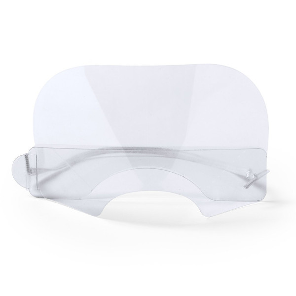 Pantalla buco-nasal con protector para barbilla y elástico de ajuste.
