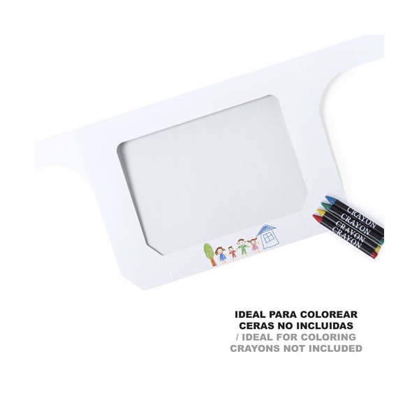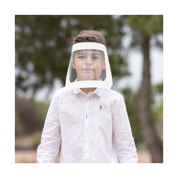 Pantalla facial para niño en PET y cartón extra-resistente de acabado mate -250g/m2-. Diseñada para que los más pequeños de la casa la puedan decorar y personalizar con dibujos. Fácil de desinfectar después de cada uso, con cinta ajustable de velcro para la cabeza y almohadilla de protección para un cómodo ajuste en la frente. Proporciona un amplio campo de visión a la vez que aislamiento frente a salpicaduras y partículas en zonas especialmente sensibles, como el área ocular, nariz y boca. Diseñada especialmente para la protección contra el COVID-19, analizada por Organismo Notificado UE. Idónea como barrera de protección higiénica adicional a la distancia social y/o al uso de mascarillas. Fabricada con materiales aptos para el contacto con la piel, con terminaciones diseñadas para un uso prolongado, sin provocar incomodidad o irritaciones.