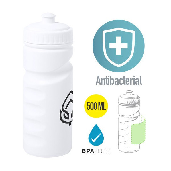 Bidón antibacteriano acabado en PE de color blanco, libre de BPA. 500ml de capacidad, con cuerpo ergonómico, tapón a rosca y dosificador de seguridad. Los productos con tratamientos antibacterianos son capaces de reducir drásticamente las cargas bacterianas presentes en las superficies de los materiales, gracias a la incorporación de agentes microbianos permanentes estáticos, con alta efectividad para inhibir y prevenir la contaminación bacteriana. Artículo de acuerdo al estándar ISO 22196, que determina la actividad antibacteriana en materiales plásticos y superficies no porosas, lo que permite conocer la efectividad de inhibición microbiana que tienen los aditivos sobre los objetos tratados mediante una evaluación cuantitativa.