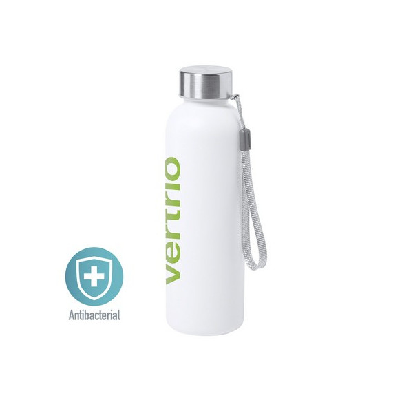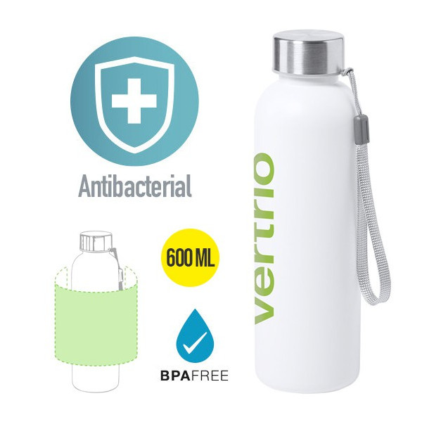 Bidón antibacteriano resistente material PE de acabado blanco. 600 ml de capacidad, con tapón en acero inox a rosca -libre de BPA- y cómoda cinta de transporte. Los productos con tratamientos antibacterianos son capaces de reducir drásticamente las cargas bacterianas presentes en las superficies de los materiales, gracias a la incorporación de agentes microbianos permanentes estáticos, con alta efectividad para inhibir y prevenir la contaminación bacteriana. Artículo de acuerdo al estándar ISO 22196, que determina la actividad antibacteriana en materiales plásticos y superficies no porosas, lo que permite conocer la efectividad de inhibición microbiana que tienen los aditivos sobre los objetos tratados mediante una evaluación cuantitativa.