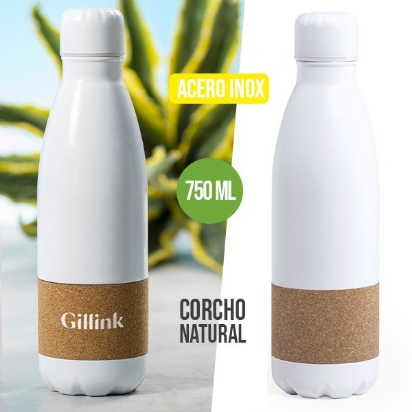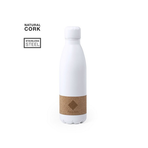 Botella- Envase de 750ml en acero inox blanco mate con franja en corcho.