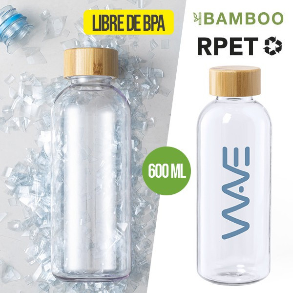 Bidón de línea nature y 600ml de capacidad. Libre de BPA, con cuerpo en RPET, elaborado a partir de plástico reciclado .