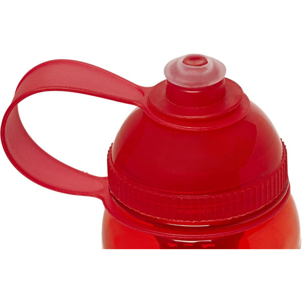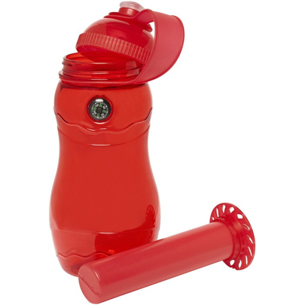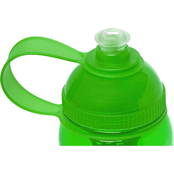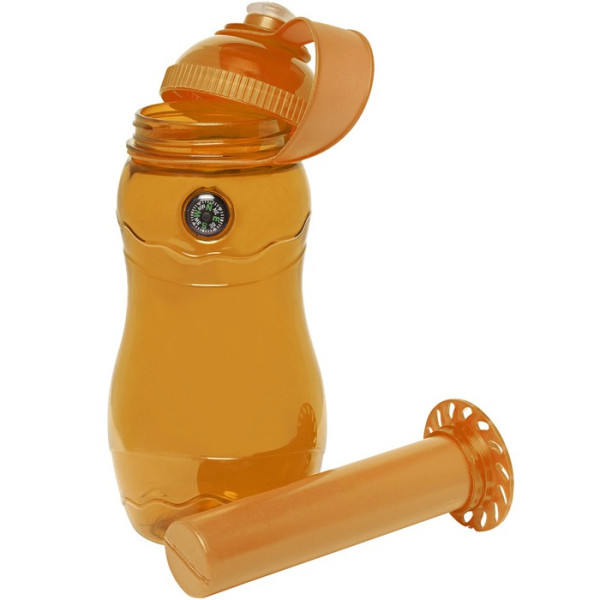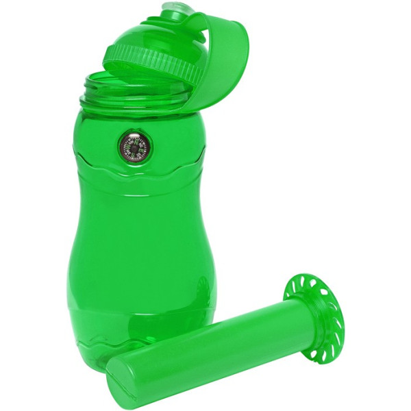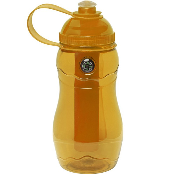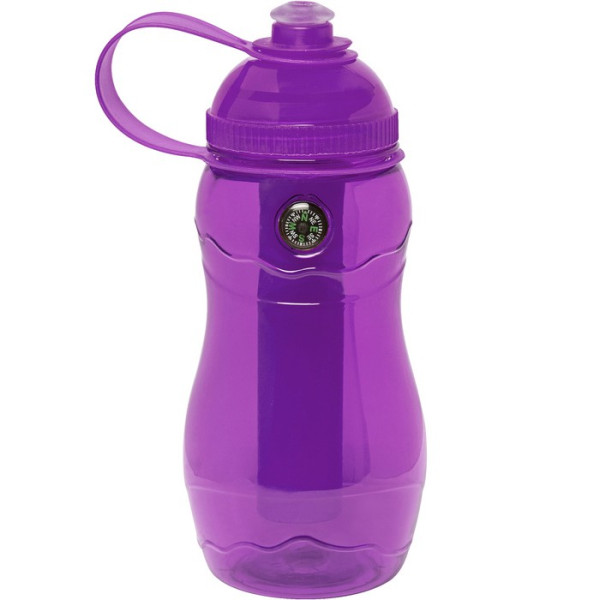 Capacidad: 500 ml. Plástico. Botella de plástico con cilindro extraíble, sirve para enfriar las bebidas, tapa rosca y boquilla deportiva de goma. Viene con brújula de decoración.