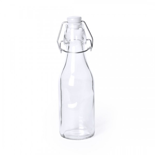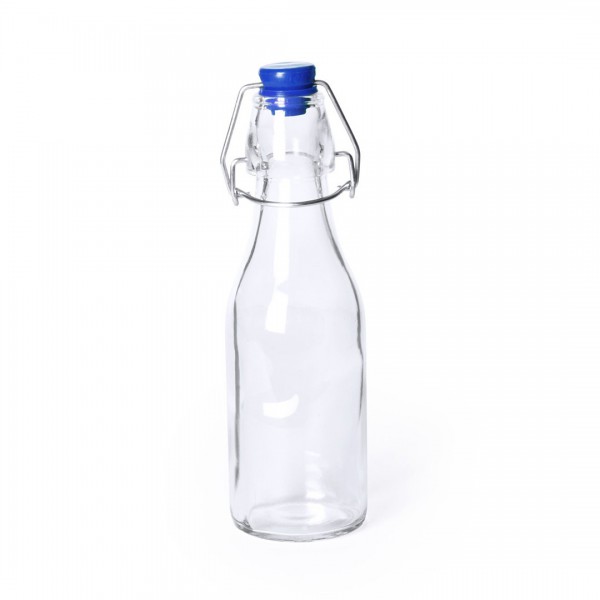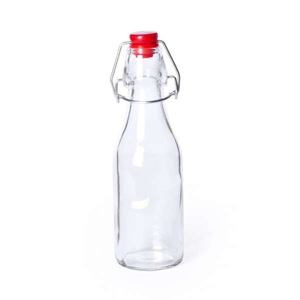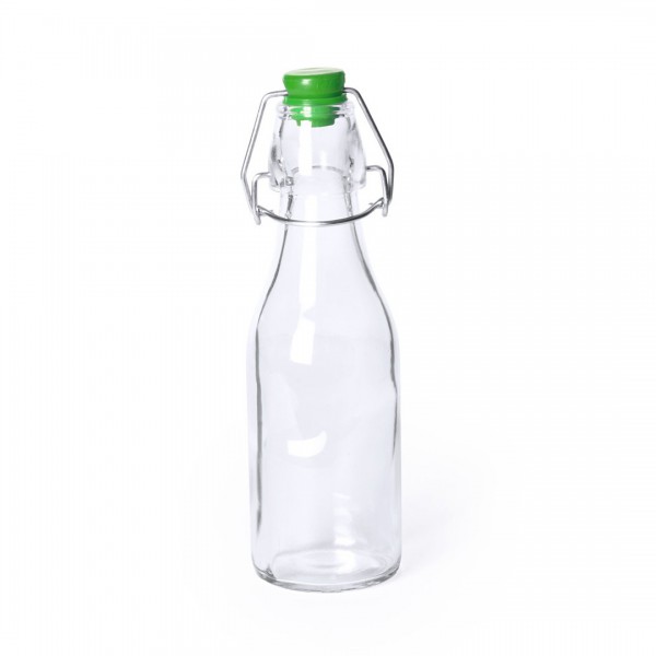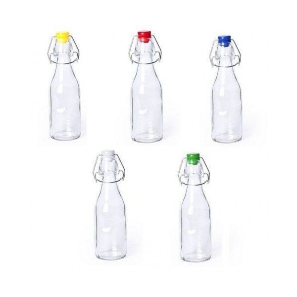 Botella de cristal de 260ml de capacidad con diseño vintage y tapón de seguridad en variada gama de vivos colores.