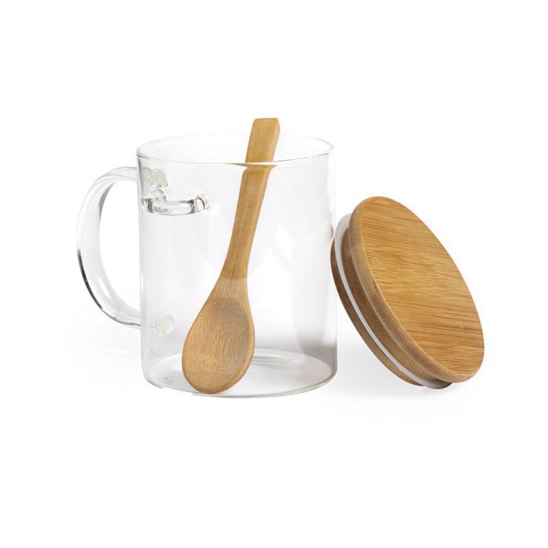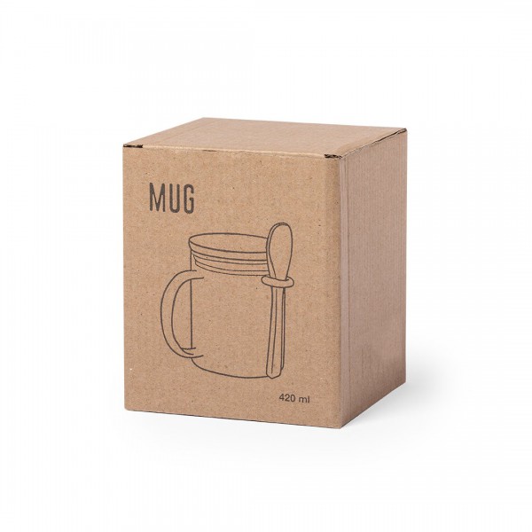 Tapa y cuchara de bambú pulido, presentada en atractiva caja de diseño eco.