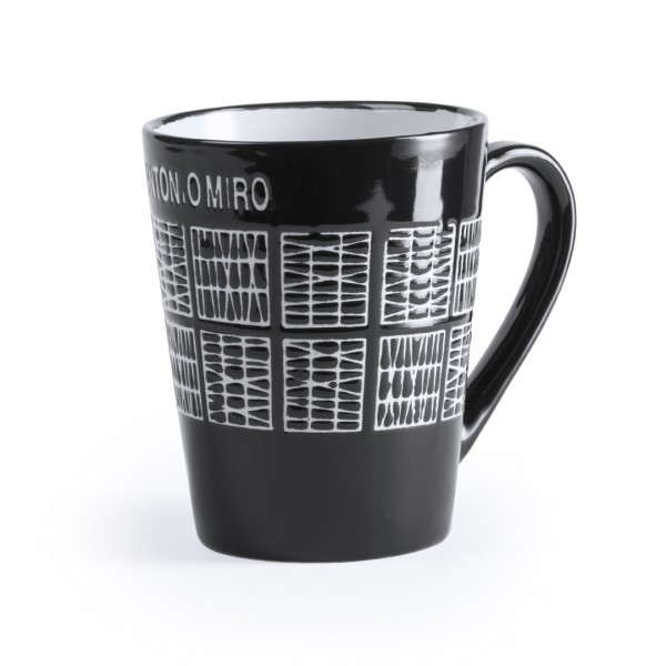 Taza de cerámica de 350ml de capacidad en elegante combinación de colores blanco y negro con diseño troquelado de la marca.